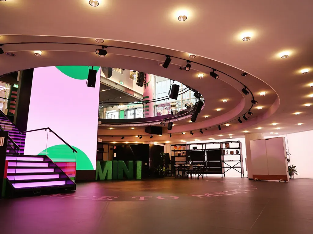 Hohe Decken · Glas & Stahl · Licht- & Sound-Setup · Automotive-Flair